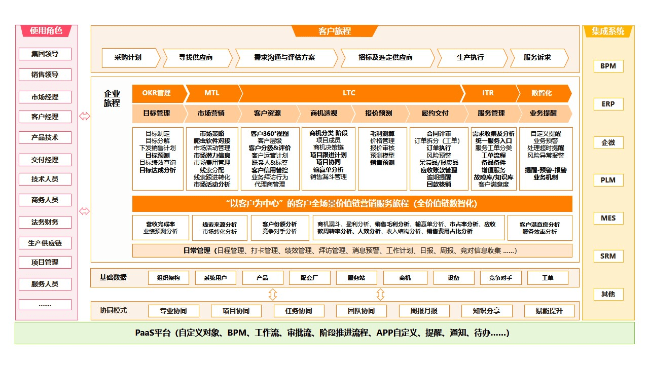 为制造业打造营销-销售-服务全链路数字化平台,通过LTC流程闭环与客户360°视图,实现从集团管控到一线执行的全角色协同,赋能智能制造企业构建以客户为中心的一体化运营体系。