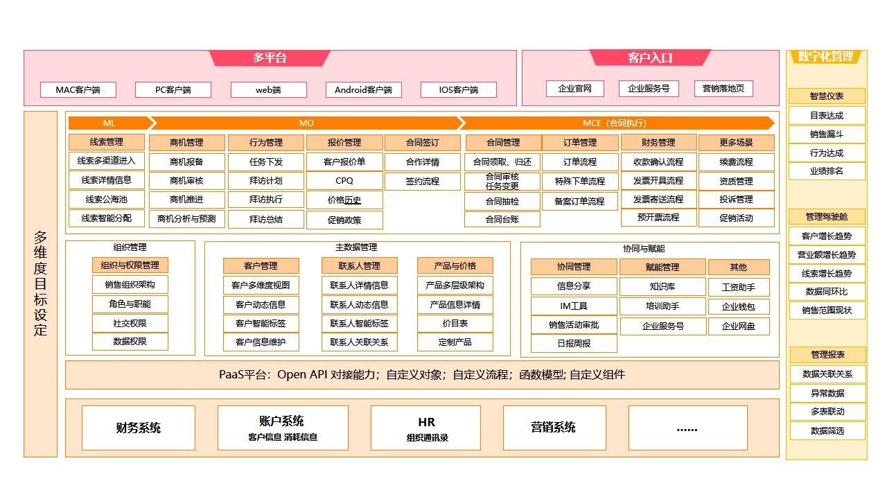 为实现集团高效管控与协同发展,该平台通过统一集团与子公司的战略思路及表达,为集团提供数据治理支持,明确集团、事业部、子公司的管控准则,落地“5D+1C”管控体系:渠道多元化方面,推动渠道下沉、提质增效,提升渠道作战能力;业务高效(人效)层面,聚焦一线赋能,强化销售过程管理,建设专业化营销能力;财务管控(钱效)上,实现从线索到回款的全流程数字化管控,规范管理流程;客户满意(客效)维度,构建以客户为中心的运营管理体系,提升客户响应效率与满意度。