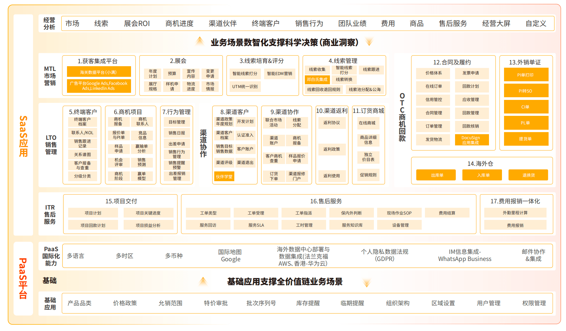 海外营销、销售管理、渠道协作、售后服务等场景的数字化支撑,帮助企业提升获客效率、赢单率、客户忠诚度,驱动海外业务持续增长。