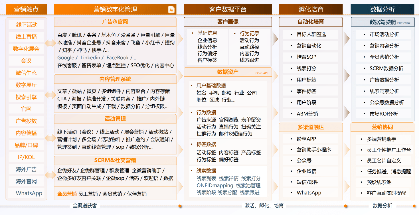 营销云的基础是数据。企业每天产生海量来自百度、抖音、微信公众号、官网表单、线下展会等渠道的碎片化数据。