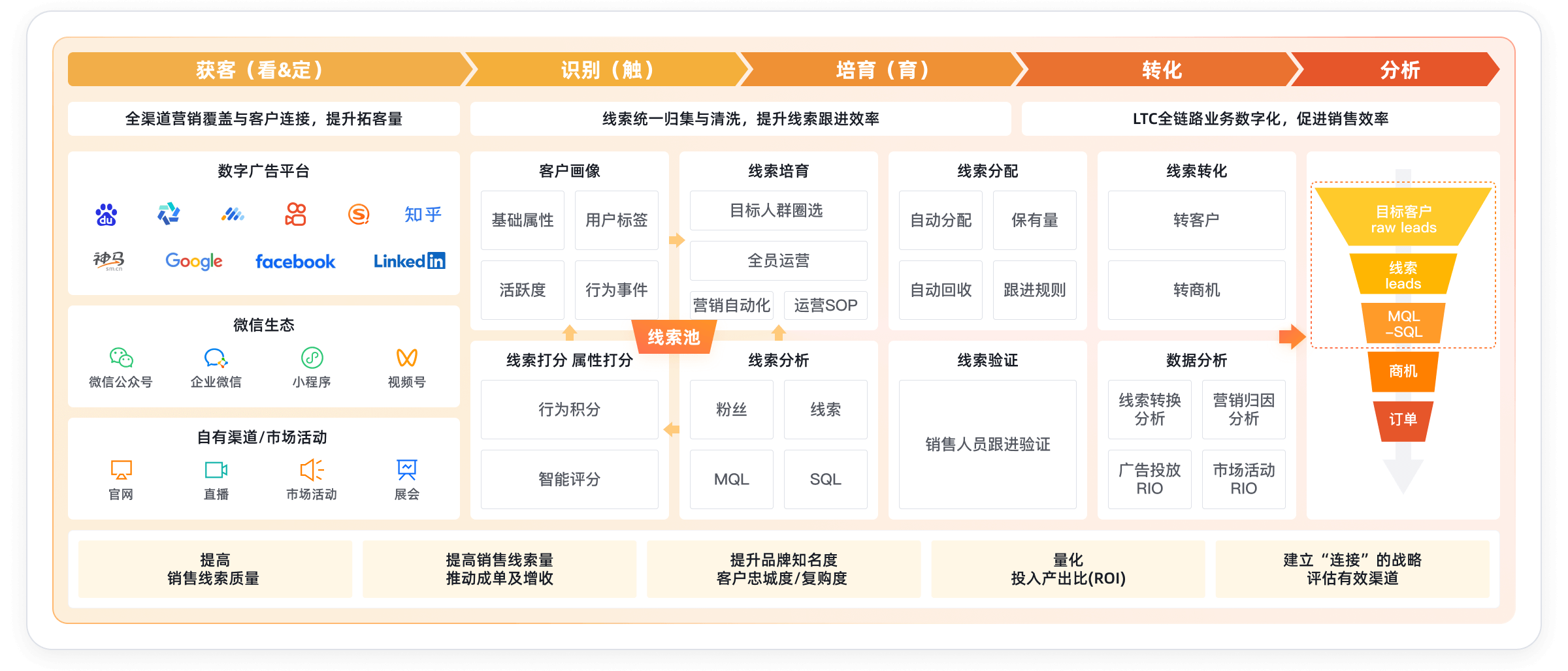 针对制造业获客渠道分散、线索质量参差不齐、营销投入产出比难衡量的痛点,围绕市场到线索(MTL)核心流程,构建数字化营销体系,实现线索的全生命周期管理,让营销投入更精准、线索转化更高效。