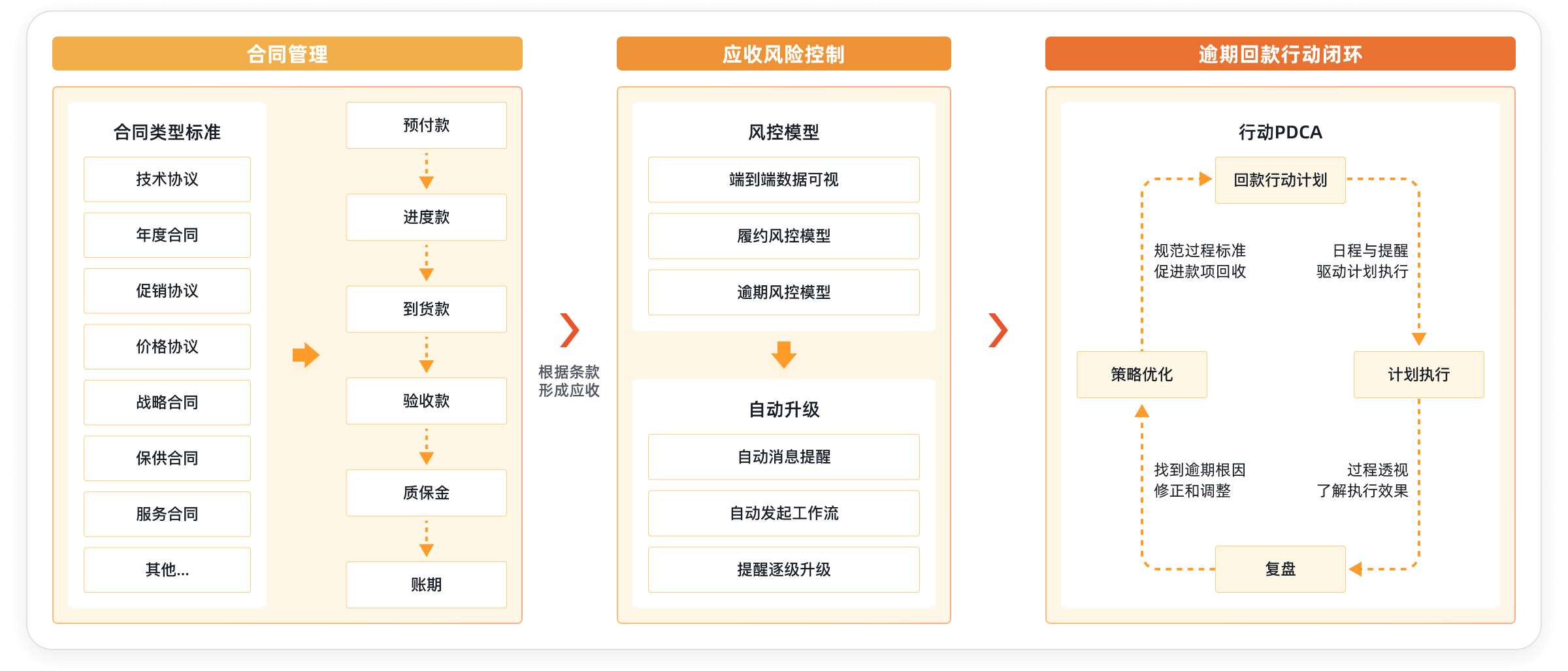 整合报价、合同、订单、交付、回款等核心交易环节,实现业务流程的端到端闭环管理,打造交易-交付-回款一体化运营体系,提升交易效率,保障资金安全。