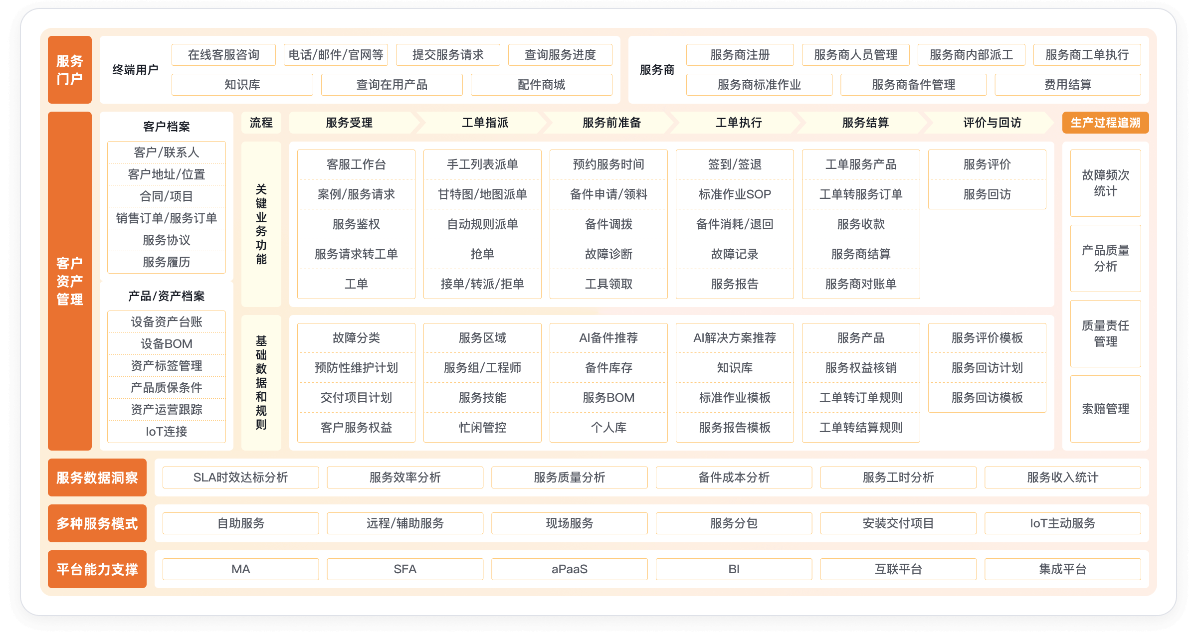 围绕问题到解决(ITR)核心流程,打造全场景的数字化售后服务体系,实现服务接入、派单、现场服务、备件管理、设备资产管控的全流程标准化,大幅提升服务效率和客户满意度。