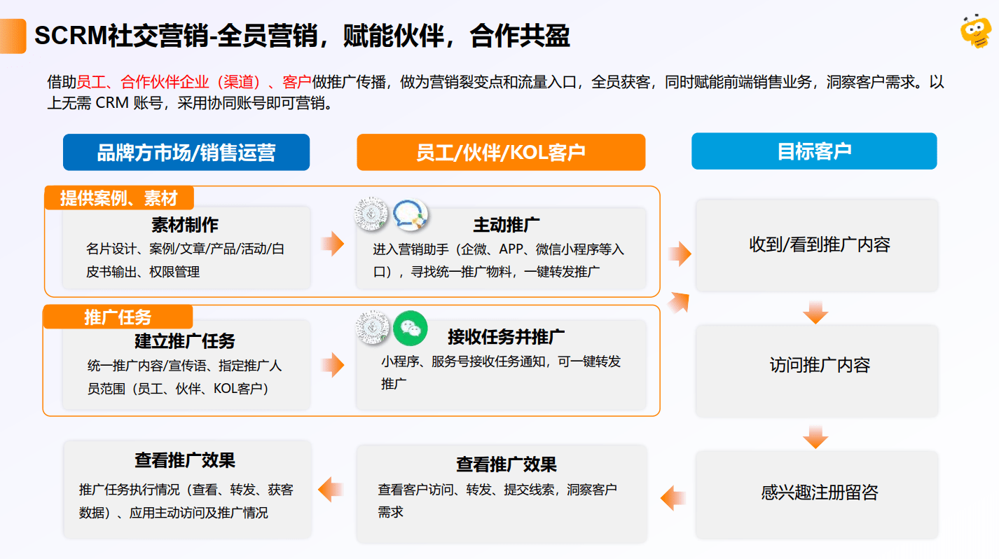 在中国独特的商业生态中,SCRM(社交化营销)更是获客利器。纷享销客打通了微信服务号、小程序、企业微信以及员工个人社交网络的公私域连接。特别是其全员营销与伙伴营销机制,允许市场部下发统一部署的推广任务。员工或经销商只需一键转发带有追踪参数的链接,任何访客的行为轨迹都会被实时捕捉并反馈给推广人,瞬间构建起多流量入口的无边界营销裂变网络。
