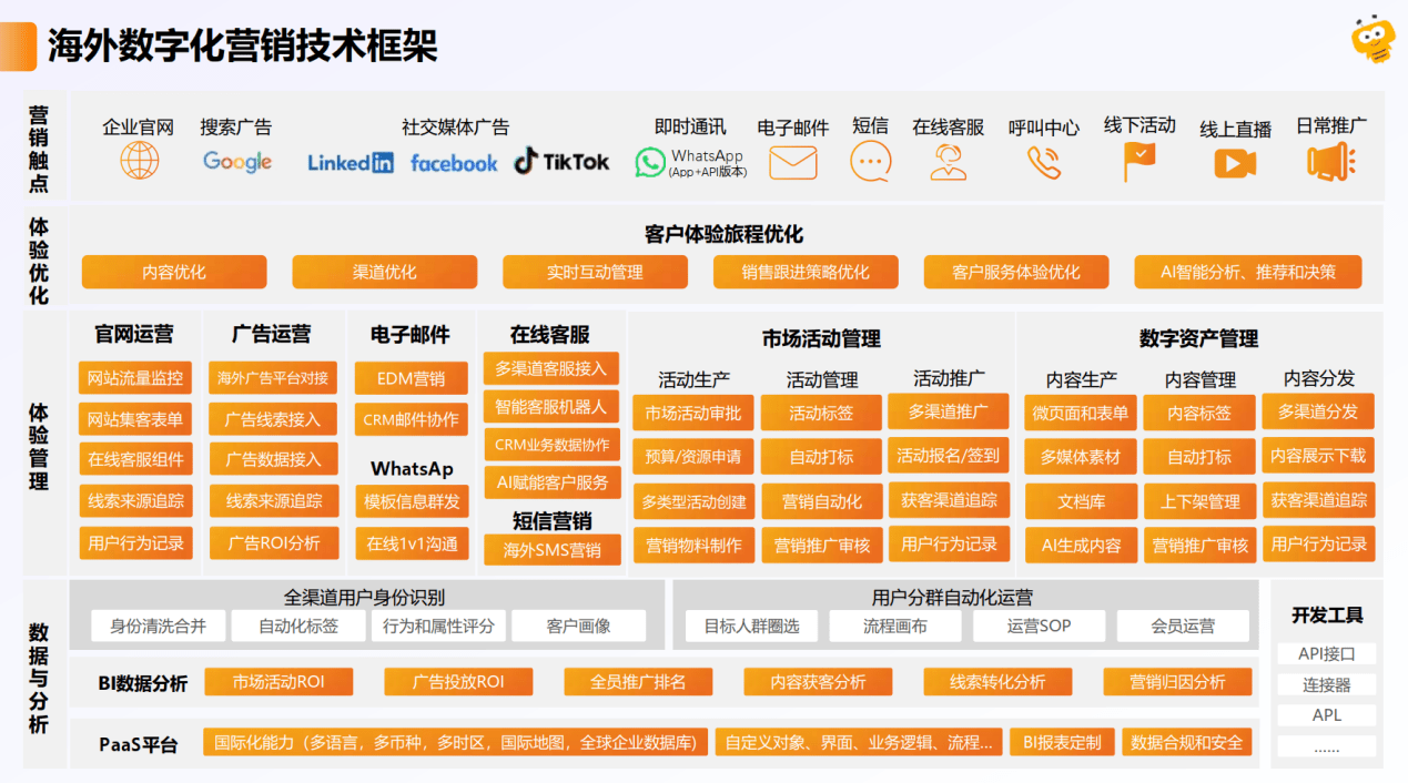 随着中国企业出海步伐的全面提速,传统的单点出海工具已无法满足复杂的本土化运营需求。纷享销客依托其强大的连接能力,构建了一套完整的海外数字化营销技术框架,打通了从“获客-识别-培育-转化-分析”的出海营销全流程,为企业在全球市场的开疆拓土提供强力引擎。
