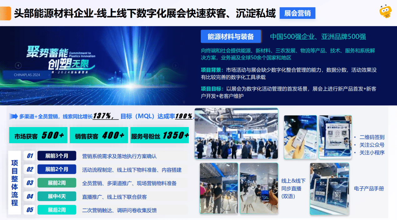 解决方案与成效:通过全面部署纷享销客营销云展会方案(EMS),企业在展前启动了多渠道的全员裂变邀约,展中则开启了线上线下双语同步直播。这一套组合拳打通了线上线下的获客壁垒。