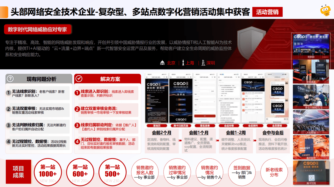 网络安全领域的企业往往依赖密集的高端行业峰会与全国巡展获客。但该企业长期面临新老线索难以识别、跨部门跟进归属不清的问题。