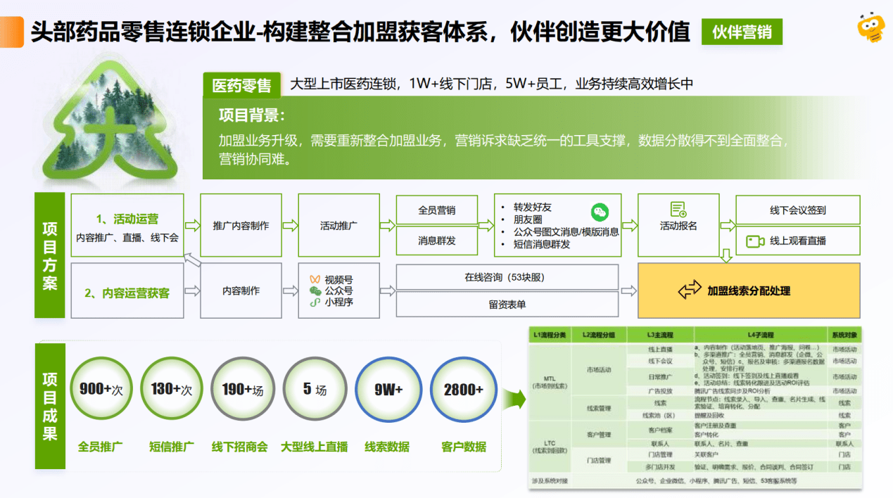 一家拥有超1万家线下门店、5万多名员工的上市医药连锁企业,在推进其加盟业务升级战役时,亟需整合极度分散的终端数据以提升招商协同效率。
