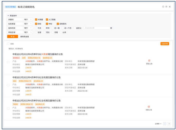 通过线下活动、标讯订阅和工商信息获取,企业可高效生成线索。纷享销客的标讯通功能支持按关键词、地区招标单位订阅增量标讯数据,并自动推送销售团队(见图5)。同时,线索池机制通过自动分配、回收和保有量控制,避免资源浪费,提升线索利用率。