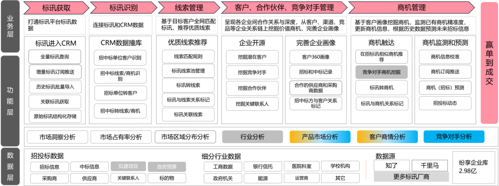 纷享销客CRM通过集成内外部数据源,提供了一站式的商情分析解决方案。例如,其“标讯通”功能可实时获取招投标数据,帮助企业快速识别潜在客户需求和竞争格局。