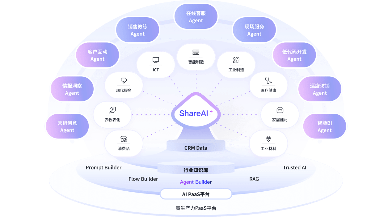 纷享销客作为国内连续5年增速第一的CRM领域领军企业,其推出的ShareAI平台,构建了企业级的AI智能体矩阵,围绕“赋能型AI”、“企业级AI”、“行业型AI”和“可信赖AI”四个维度展开,ShareAI平台贯穿AI应用层、能力层、平台层直至基础设施层,支持灵活接入多种主流商用及私有大语言模型。