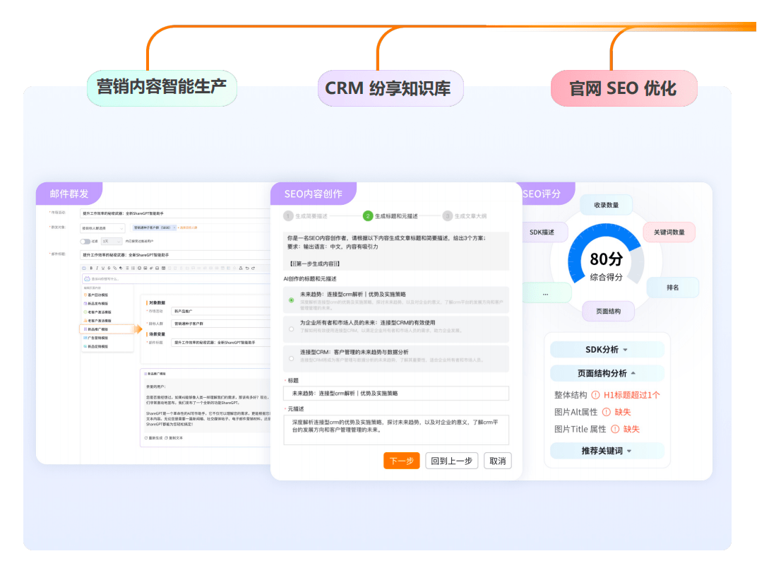 在内容创作上,它能基于CRM业务数据与行业知识库,快速生成活动策划方案、推广海报、邮件文案、SEO文章等多类型物料,提供30+预置业务场景模板,将营销策划从“作文题”转化为“填空题”,解决B2B产品内容创作难、质量与效率失衡的问题。