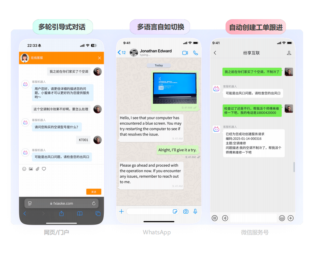 在应对客户问题时,无需人工值守即可解决大量基础重复性问题,像设备开机故障排查、服务进度查询这类咨询,其解决率可达80%,大幅减少了客服人员的重复劳动。