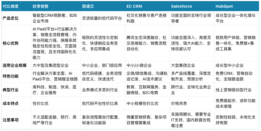 本文将对当前市场上备受关注的五款主流CRM软件,包括国产的纷享销客、简道云、EC CRM,以及国际知名的Salesforce和HubSpot——进行一次全面的横向对比与深度解析。