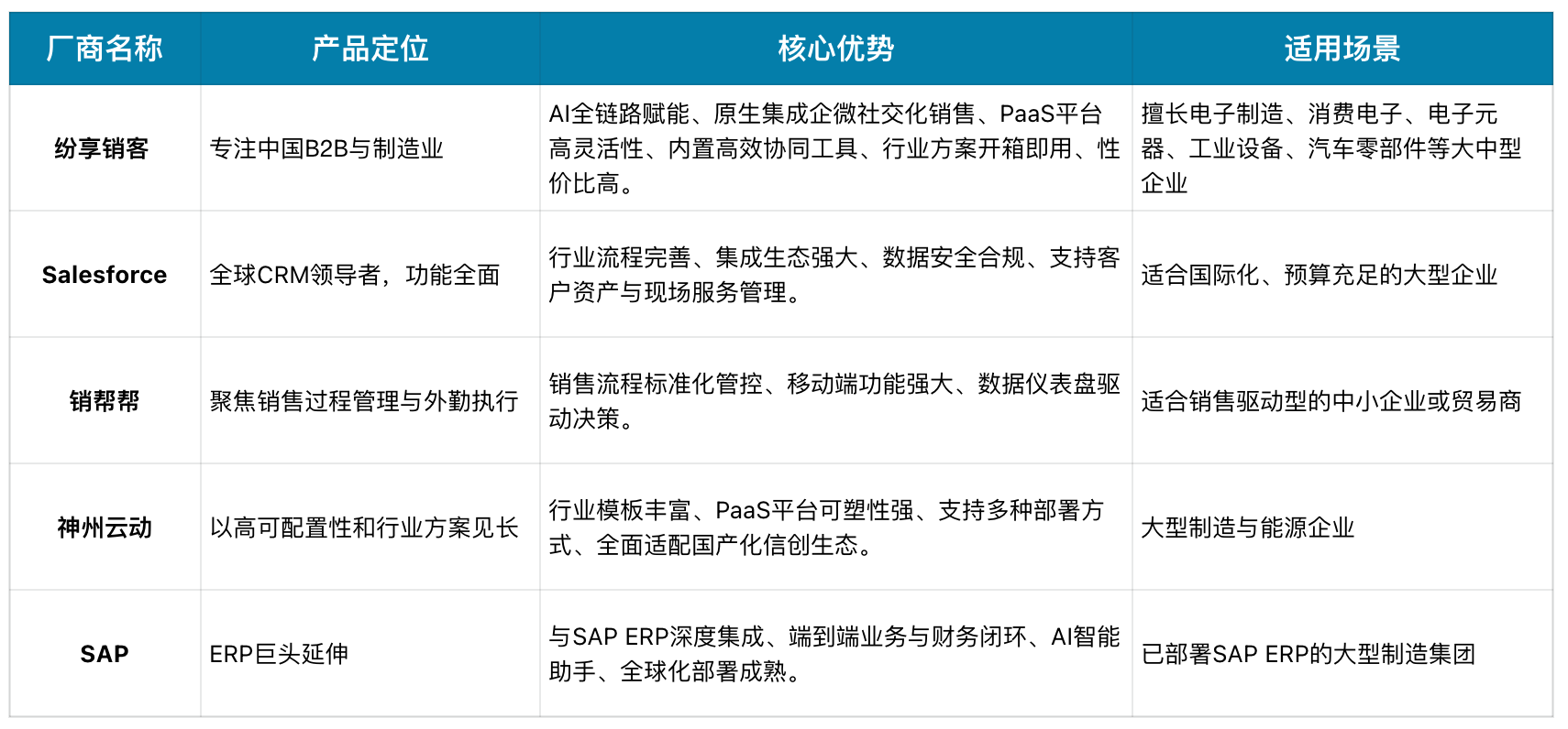 本文专为电子制造企业设计的CRM选型决策框架,对市场上五款主流CRM系统,包括纷享销客、Salesforce、销帮帮、神州云动、SAP等进行深度分析~
