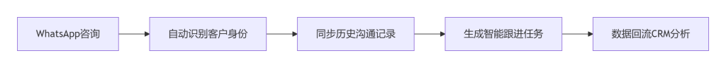 当海外客户通过官网WhatsApp插件发起咨询时,系统基于手机号自动匹配客户信息,实时呈现: