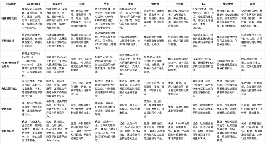 salesforce、纷享销客、红圈、用友、金蝶、销帮帮、八百客、EC、腾讯企点、励销