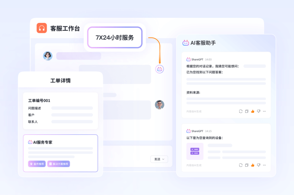 AI客服智能体:7*24小时在线的服务专家:集成多模态识别能力(图文、语音)的AI客服智能体,能够提供全天候的多语言自主服务。它可即时响应客户常见咨询,精准洞察客户深层需求,并自动创建服务工单,分配至最适合的客服人员,大幅提升问题首次响应与解决的时效,确保客户问题不被延误。