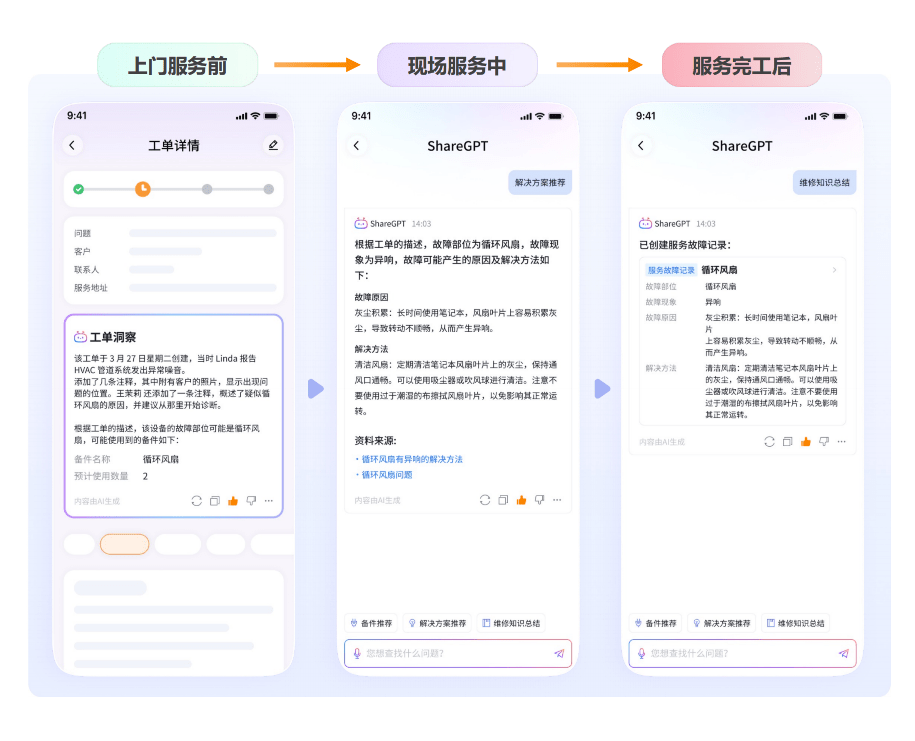 AI现场服务助手:助力一线工程师高效服务,对于涉及现场交付与维修的场景,AI助手的作用尤为突出。它能够基于客户的服务履历与产品知识库,在工程师出发前就智能推荐可能需要的备件清单与历史解决方案,有效提升首次修复率。服务完成后,AI还能自动总结维修过程,形成标准化的服务案例沉淀到知识库,实现企业知识的高效复用与团队能力的快速提升。