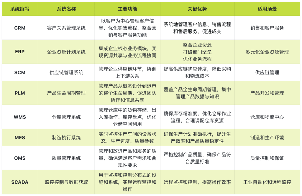 在日益复杂的商业环境中,企业管理系统的集成化与智能化已成为提升核心竞争力的关键。理解CRM、SCM、PLM、WMS、MES、QMS、SCADA等系统各自的独特价值,并认识到它们之间协同工作的巨大潜力,是企业实现高效运营、敏捷响应市场变化、驱动可持续增长的基石。