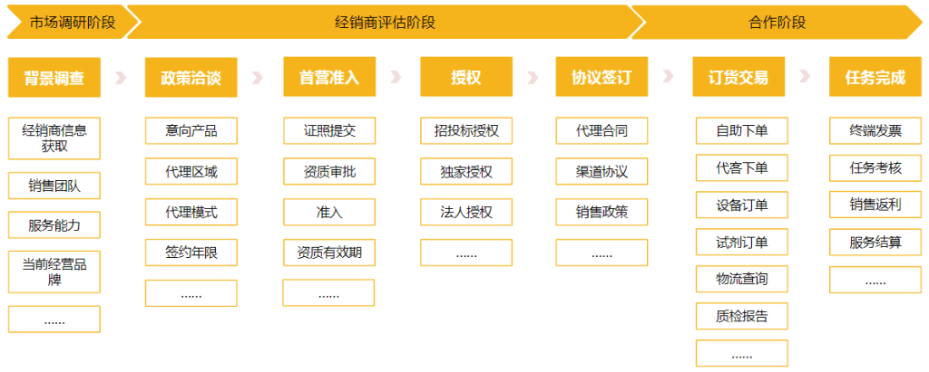 (3)合作阶段,在签订包括代理合同、渠道协议和销售政策等协议后,渠道商再次进行订货交易时,可以进行自助下单、代客下单、设备订单、试剂订单等不同的下单方式,下单后可以进行物流查询,获取质检报告。订单完成后进行终端发票、任务考核、销售返利和服务结算等收尾工作。