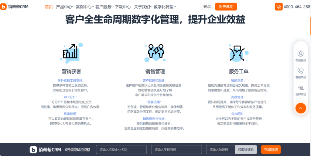 销帮帮CRM集成了客户管理、订单管理、销售流程跟踪等功能,支持从线索获取到订单完成的全流程管理。其他功能包括市场管理、资金管理、工单管理和进销存。