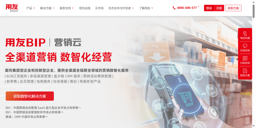 用友是老牌国产企业管理软件供应商,从财务软件起家,经过30多年发展,进化为用友BIP,定位为数智商业创新平台,为大中小型企业提供财务、人力、供应链、营销、采购、研发、项目、协同等方面的管理系统支持,用友CRM是用友营销云的一部分。