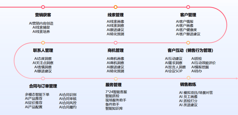 1.全业务化:实时对场景进行洞察,理解业务逻辑,实现作业场景的闭环。与具体行业的业务场景深度融合,覆盖营销、销售、服务等全流程,形成针对性的智能解决方案。