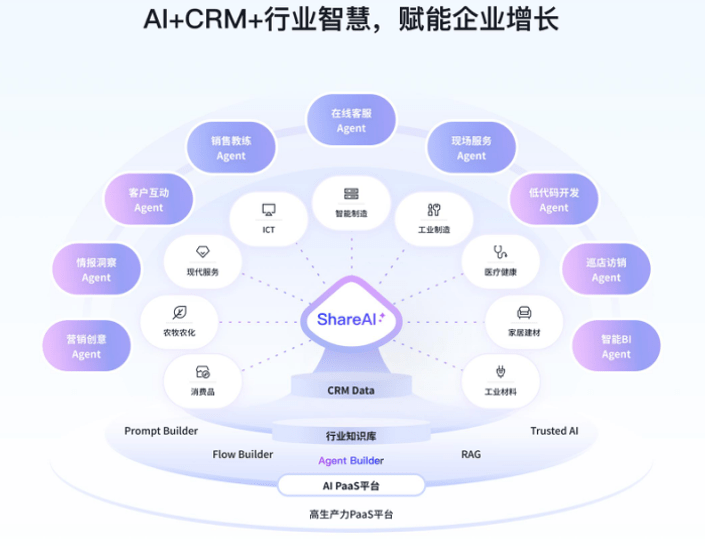企业级ShareAI平台以纷享销客PaaS平台为基石,在此基础上构建 AI PaaS平台,基于平台能力,通过整合行业知识与多模态AI能力,为不同行业场景提供定制化的智能赋能,形成“AI+CRM+行业智慧”的核心设计原则。无论是营销中的线索筛选、销售中的商机洞察,还是服务中的智能客服,纷享销客的Agent都能依托AI PaaS平台与行业知识,实现高效赋能,助力企业构建智能化、闭环的业务体系。