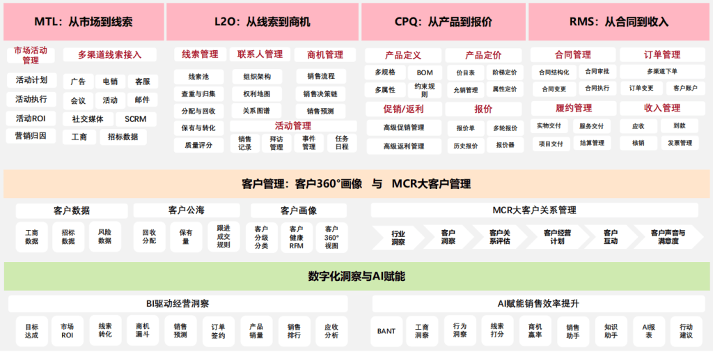 以纷享销客CRM为例,销售管理的核心优势在于“全流程覆盖+智能化驱动+行业化适配”,其产品体系以销售自动化(SFA)为基础,整合市场到线索(MTL)、线索到商机(L2O)、配置和定价与报价(CPQ)、收入管理(RMS)等关键模块,形成端到端的闭环管理。同时,通过MCR(管理客户关系)体系实现从“机会导向”到“客户导向”的战略转型,结合最新的AI销售Agent生态,为不同规模、不同行业的企业提供可落地、可量化的销售管理解决方案。