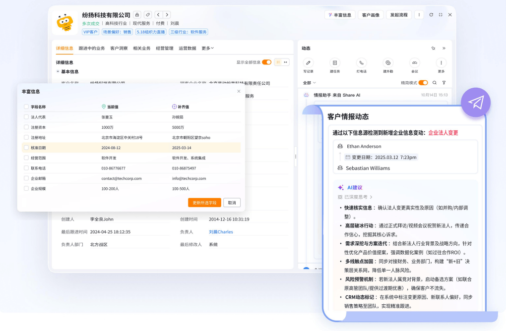 客户360°画像:整合工商信息、联系人、互动记录、商机历史、财务数据、风险信息等多维数据,构建完整的客户视图。例如,销售人员在跟进某制造业客户时,可通过系统直接查看企业注册资本、经营状态、招投标记录、历史合作情况、关键决策人画像等信息,快速制定跟进策略。