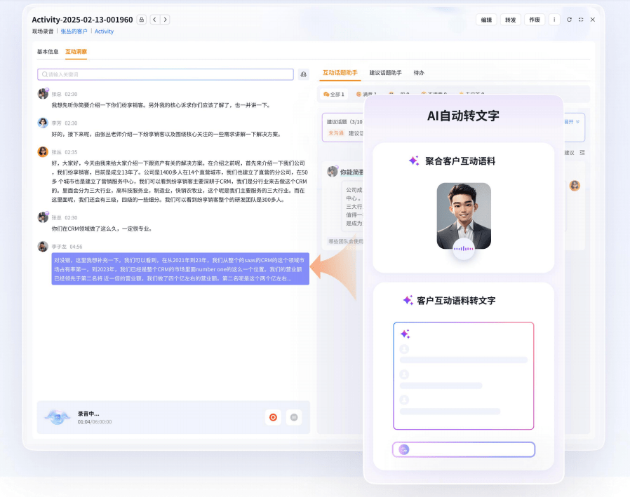 核心功能:支持全通路客户互动(电话、在线会议、现场会议、邮件、客服会话等)的实时录音转写与多模态语料分析;自动识别关键话题、客户需求、痛点、决策人态度、互动热度等;提供实时话术推荐、知识助手、问题应答支持;会后自动生成互动总结、待办任务与跟进建议。