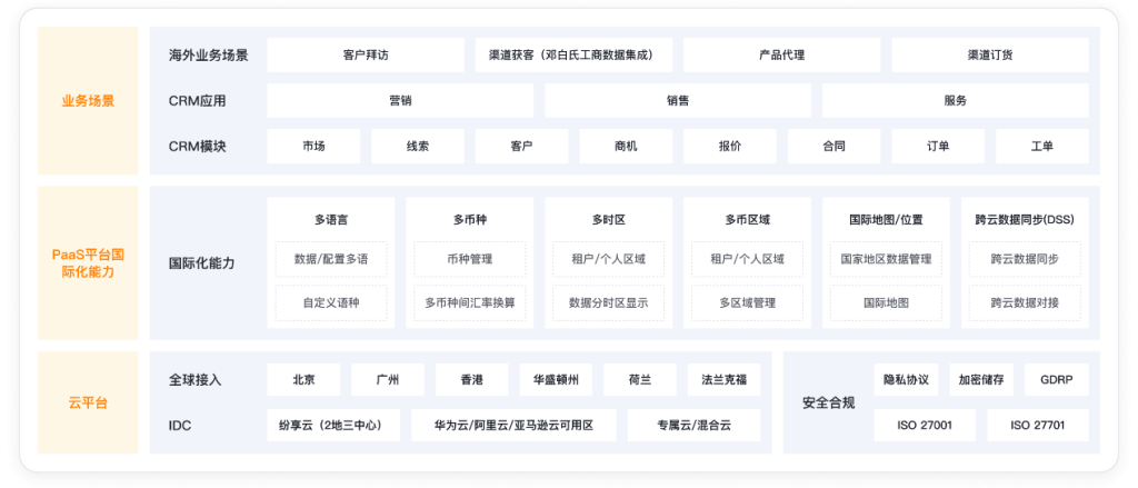【选型标准】 随着中国企业出海,CRM必须具备全球化支撑能力。硬指标包括:多语言/多币种/多时区支持、海外节点部署以及GDPR等国际合规认证。