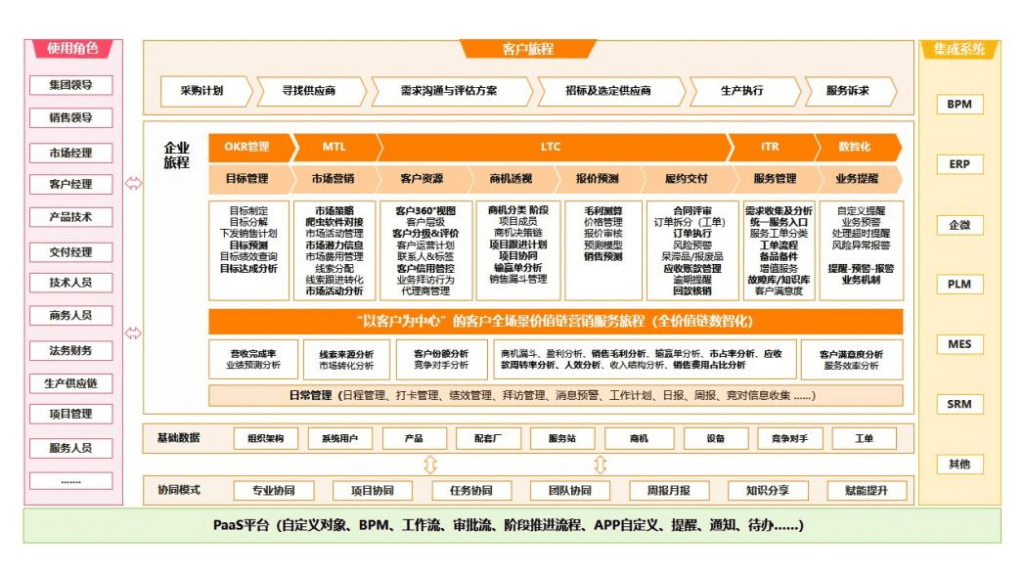 业务价值聚焦于产业链协同与数据资产化,致力于解决集团型客户全链路闭环管理问题,让央国企在使用过程中切实感受到高效与适配。在政策合规方面,其支持“三重一大”决策流程,将合规风控节点嵌入业务全流程,能自动校验操作是否符合政策要求,让合规管理融入日常业务,减少人工干预的疏漏;产业链协同上,通过连接上下游供应商和客户门户,打破传统协作中的信息壁垒,让订单流转、需求沟通等环节更顺畅,显著提升生态伙伴间的协同效率;针对央国企项目制特征的大客户项目管理,提供从招标、履约到回款的全流程可视化管理,且能与ERP等系统深度集成,实现数据互通、流程衔接,避免信息孤岛导致的管理脱节;差异化功能则精准适配央国企多法人架构特点,支持跨组织数据权限灵活配置,既能满足集团对整体业务的管控需求,又能让下属单位拥有一定的业务自主权,真正实现“集团管控+灵活自主”的平衡,让系统好用且贴合实际业务场景。