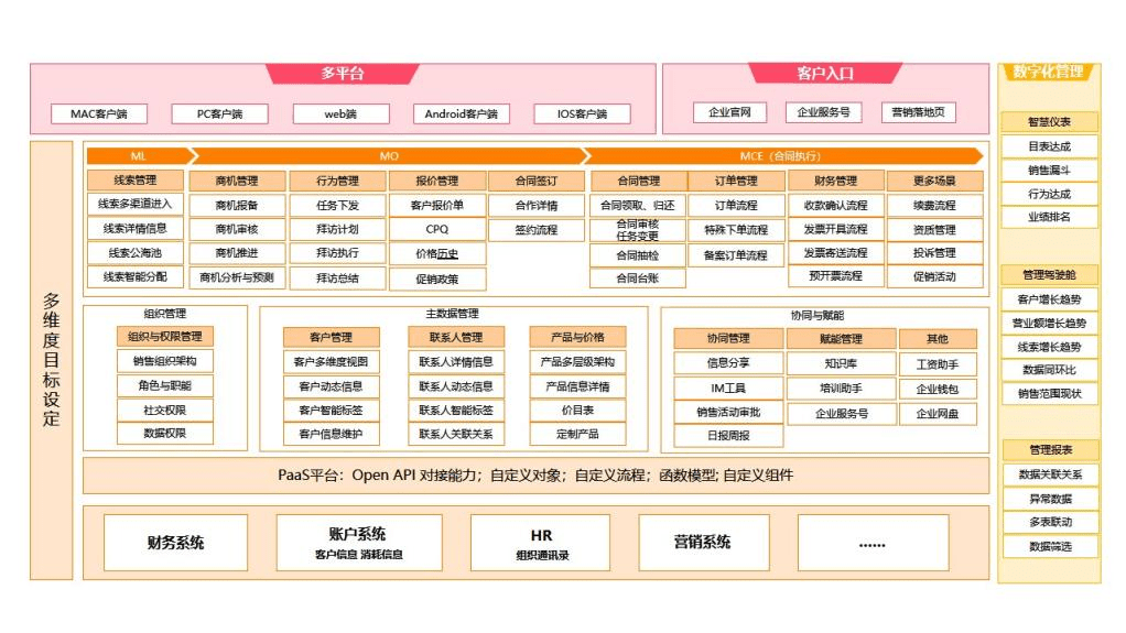 依托这一平台,CRM的核心价值得以充分释放:在主数据统筹上,整合集团矩阵架构下的数据权限,支持多事业部共同服务同一客户,实现客户资源利用率最大化;在跨租户赋能上,推动资源在集团范围高效共享,形成全业务数据闭环,为各业务角色提供有力支撑,助力其高效开展工作;在智慧决策上,提升业务分析的准确度与企业管理水平,确保业务过程可控、结果可视,为集团战略决策提供坚实依据。