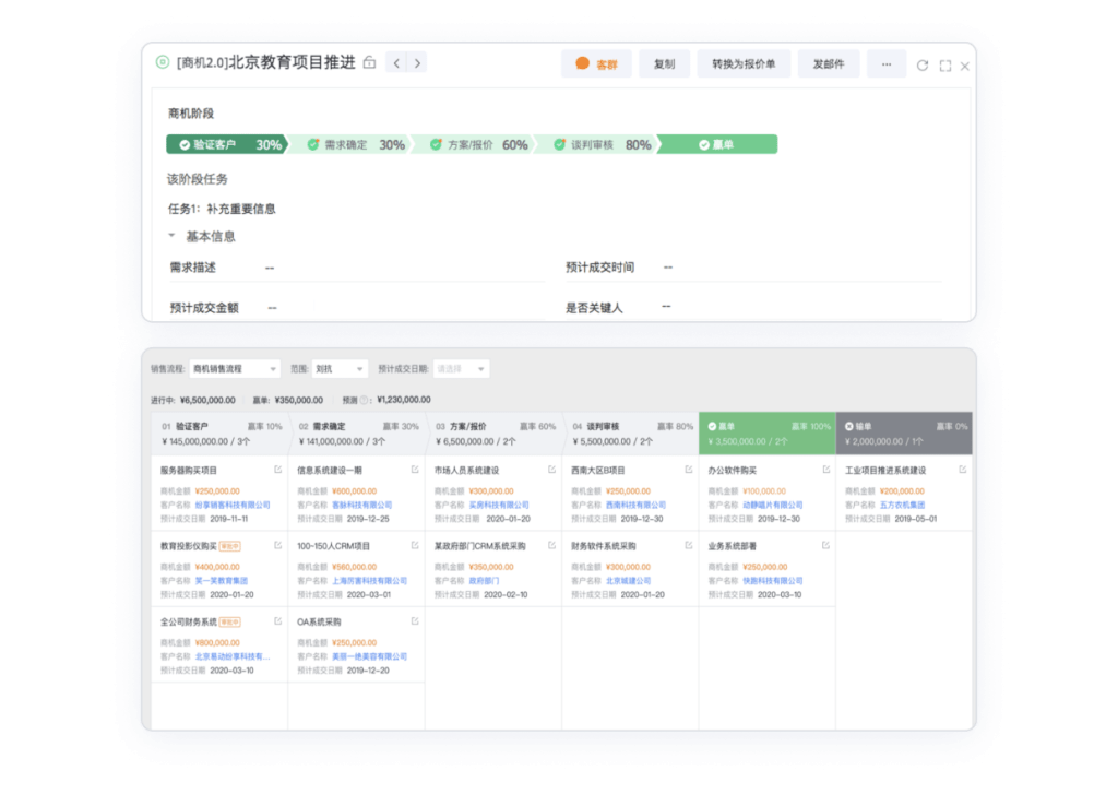核心功能:支持高度自定义销售阶段(如政府项目8阶段、快消行业4阶段),强制要求完成关键动作(如提交决策链分析、竞争报告)才能推进阶段,确保流程规范性
