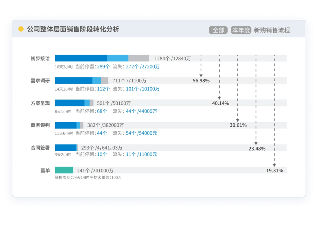 一、商机管理的战略价值重构:从机会捕捉到价值转化商机管理通过销售漏斗的动态可视化,实现从机会发现到价值转化的全链路追踪。纷享销客的实践数据显示,采用智能商机管理系统的企业平均销售周期缩短37%,转化率提升42%。该系统通过对商机储备量、阶段停留时长、竞争对手赢率等12项核心指标的实时监测,为管理层提供战略调整的数据支撑。