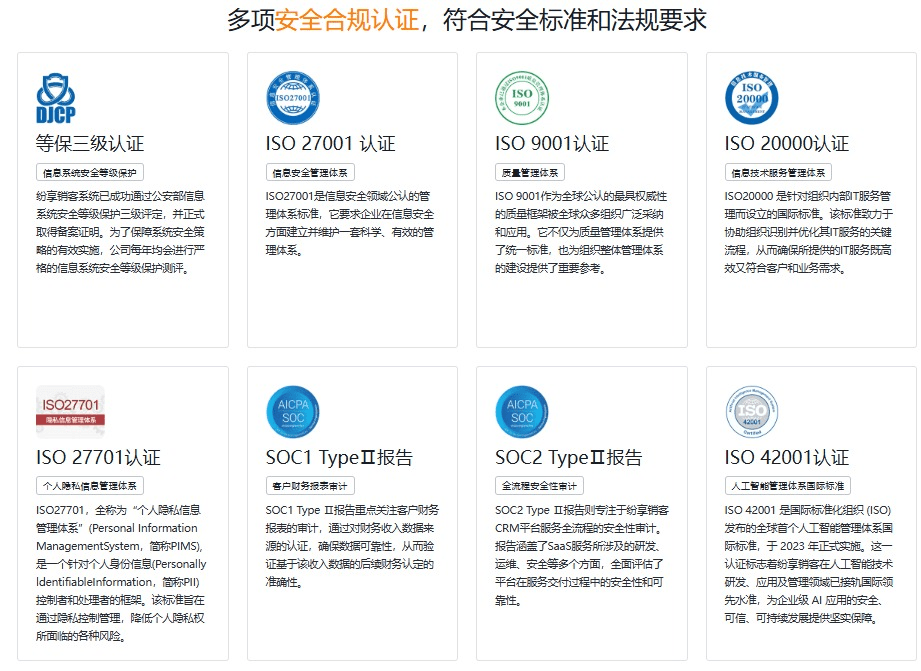 数据主权与安全是企业的生命线,不容妥协。纷享销客将数据安全和客户资产归属视为最高准则,遵循严格的数据隐私法规。其提供银行级别的安全防护、多地备份和透明可控的数据管理策略,确保企业对自己的数据掌握完全的控制权,让管理者能安心专注业务发展,而非担忧数据风险。 |