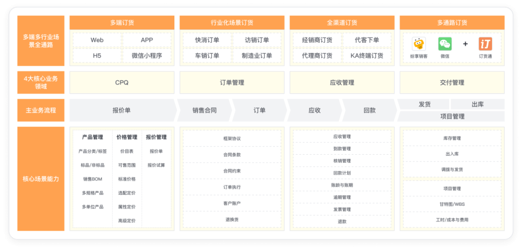 交易管理是从订单到现金(Oder to Cach)这一组业务流程相关管理,可帮助企业简化、自动化、跟踪和履行客户订单从启动下单到最终交付的过程。交易管理作为CRM系统的重要模块,覆盖从询价、签约到交付回款的全业务流程。以纷享销客智能型CRM系统为例,它将交易管理拆解为四大核心组件: