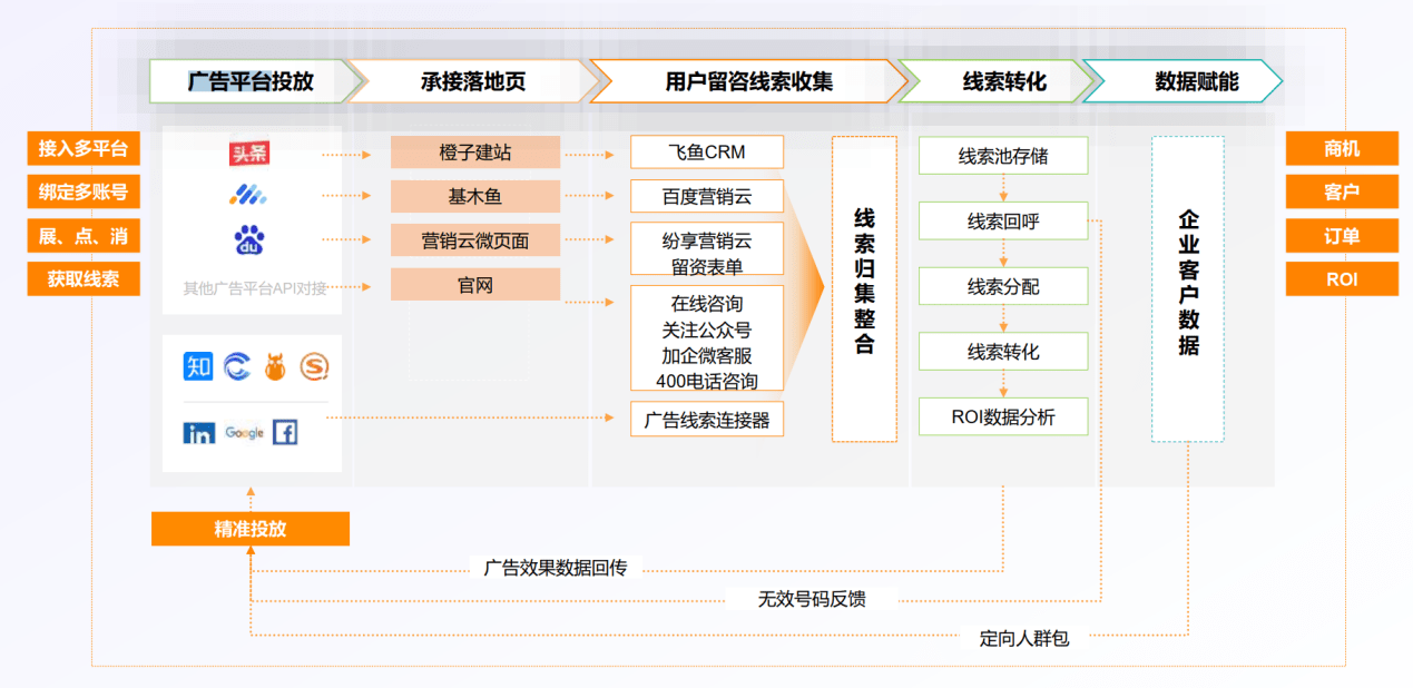 纷享销客提供了业内极具穿透力的归因能力,通过API深度对接百度搜索、基木鱼、腾讯广告、头条巨量引擎、Google、LinkedIn等多维广告平台。