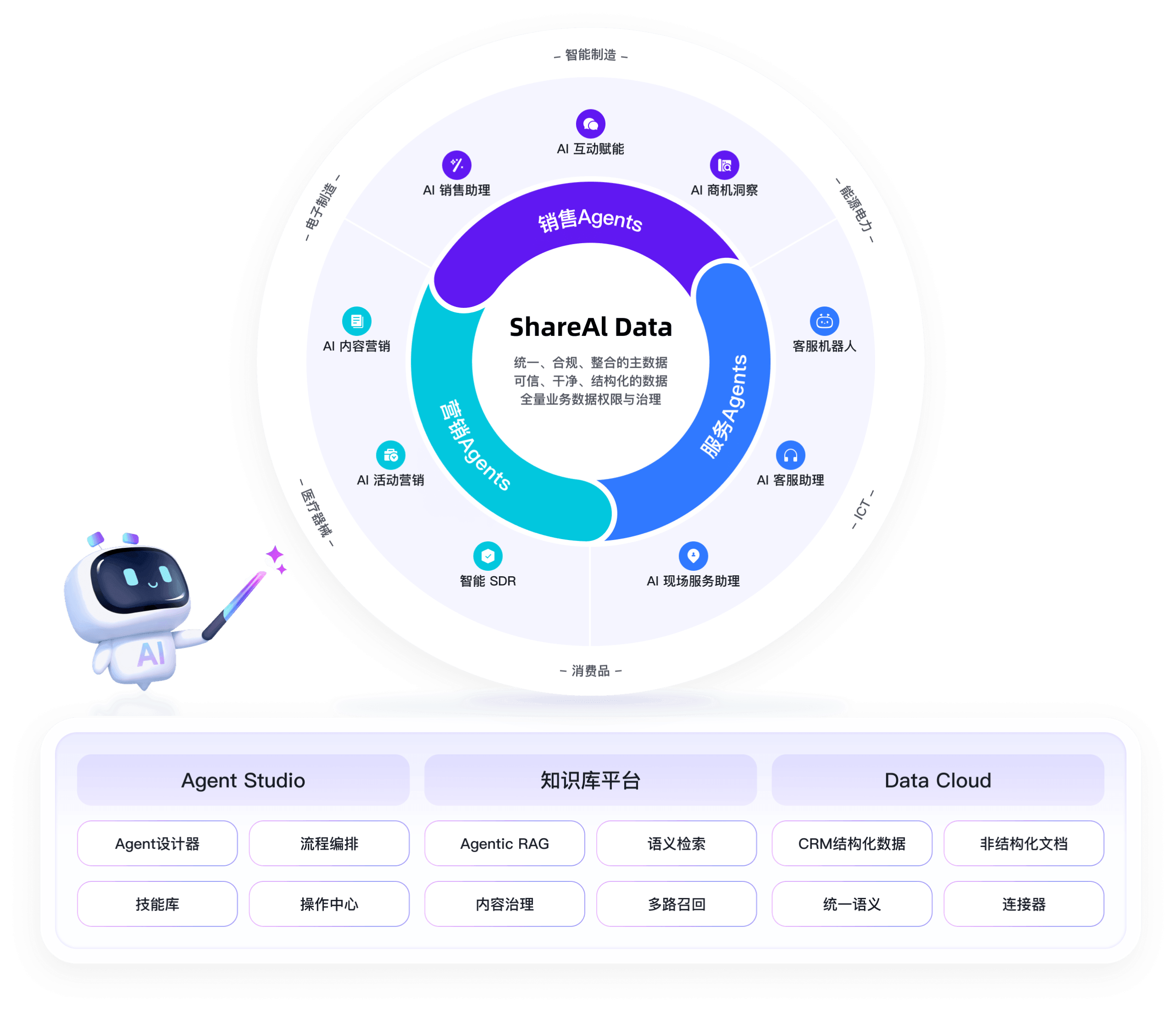 不同于传统CRM仅聚焦于客户信息记录,统享销客 AI PaaS 平台(ShareAI)的多模态多模型 AI 引擎,企业可敏捷构建场景化的CRM智能体(Agent),深度对接企业CRM业务数据、私有化行业知识库及外部市场情报,打造营销、销售、服务等全场景下的数据洞察-推理决策-行动建议等智能体矩阵。