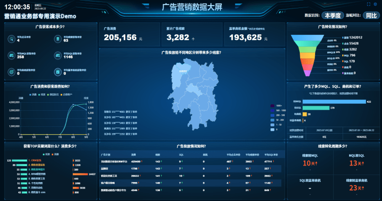 纷享销客营销云提供预设数据驾驶舱、广告数据大屏等多种数据分析工具,帮助营销团队从多个维度分析广告效果,全链路追踪ROI。
