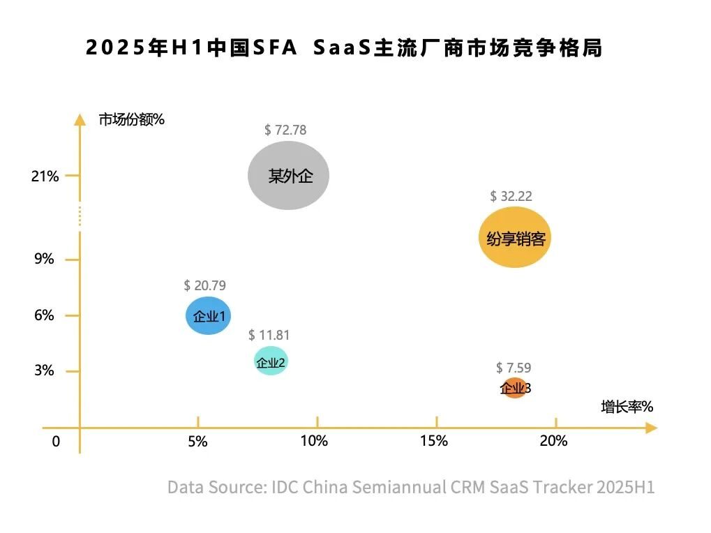 近日,全球权威咨询机构 IDC 发布的《2025年上半年中国 CRM SaaS 市场跟踪报告》中数据显示,纷享销客在 2025 年上半年以近 10% 的市场占有率、18% 的同比增长速率,双双位居中国本土 CRM SaaS 厂商榜首,持续领跑 CRM 行业。