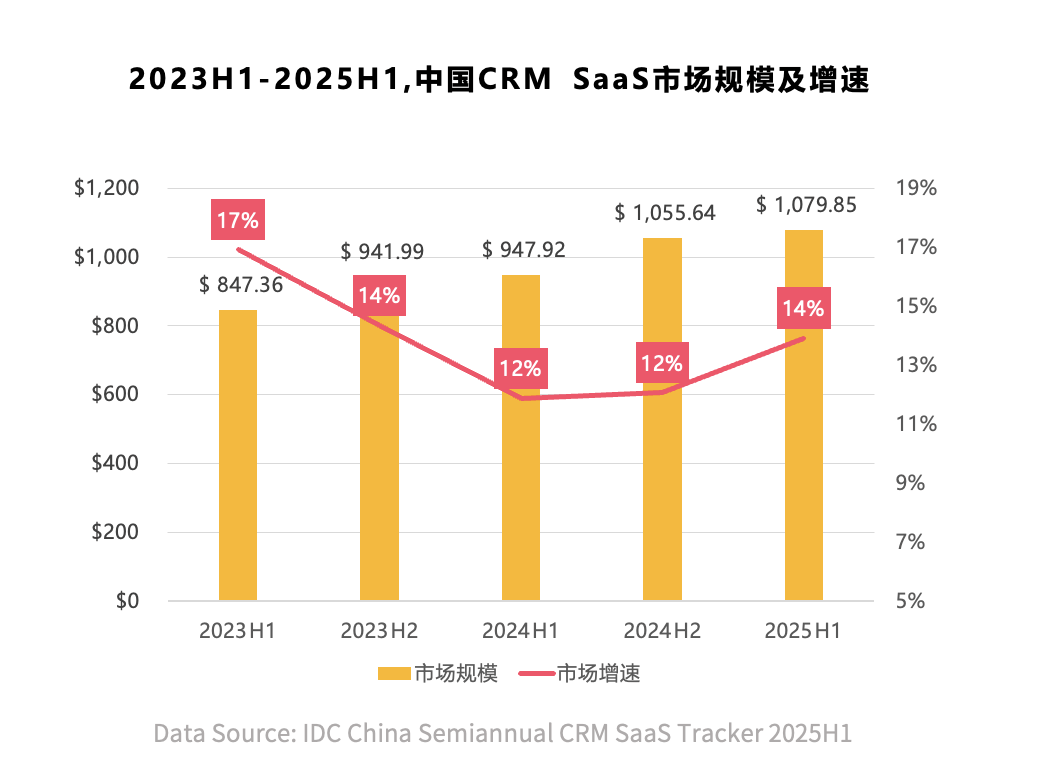 据 IDC 报告数据显示,2025 年上半年,中国 CRM SaaS 市场达到 10.8 亿美元,同比增速 14%,增长率和 2023 年下半年持平,对比 2024 年全年 12% 的增长率有所回升。这得益于中国企业的数字化转型进一步加速和深化,特别是 AI 技术的迅猛发展,激发了企业高层对 IT 基础设施和软件系统的兴趣与认可,大中型企业更希望通过数字化和智能化手段,帮助企业获得更进一步的业务增长。