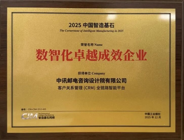 纷享销客客户中讯邮电咨询设计院有限公司(以下简称“中讯院”)凭借“客户关系管理(CRM)全链路智能平台”,成功入选由中国工业报社数智工业研究中心发布的“2025中国智造基石名录”,并荣获“数智化卓越成效企业” 称号 。