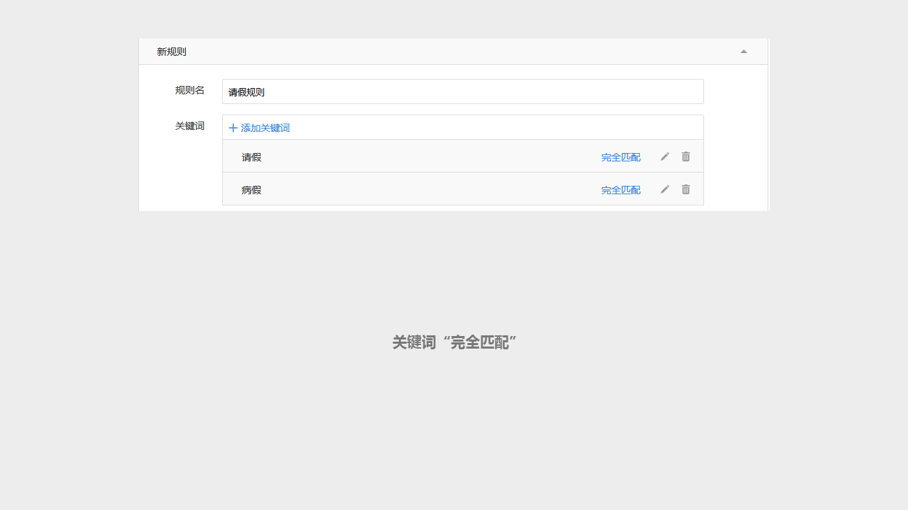 对方发送的内容与设置的关键词须完全一样,才会触发关键字回复,不能多一个字符也不能少一个字符。比如设置“病假”,仅回复“病假”才会触发关键词回复。