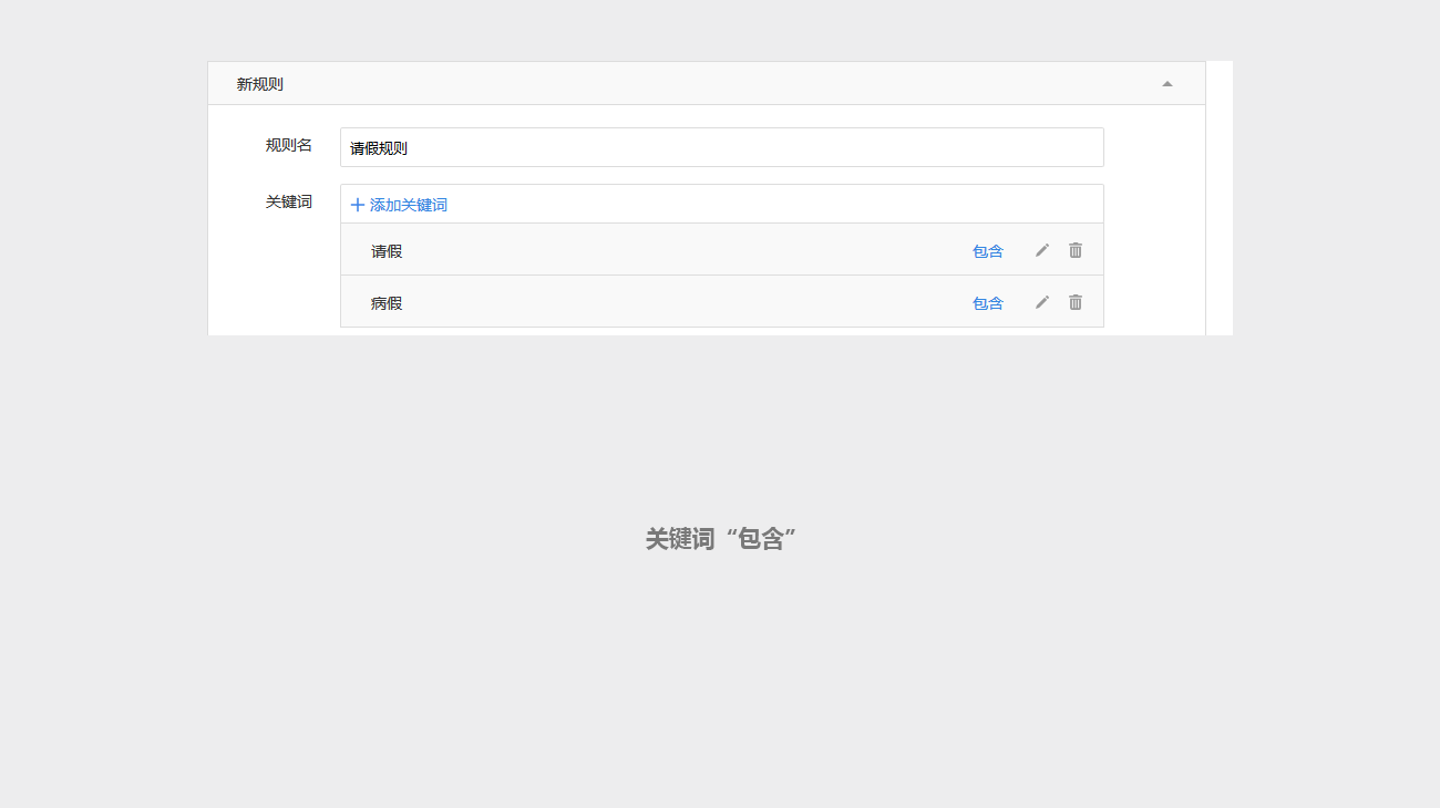 只要对方发送内容包含设置的完整关键词,就会触发关键词回复给对方。比如设置“病假”,回复“本月病假”会触发,但回复不完整的关键词“生病”则不会触发关键词回复。