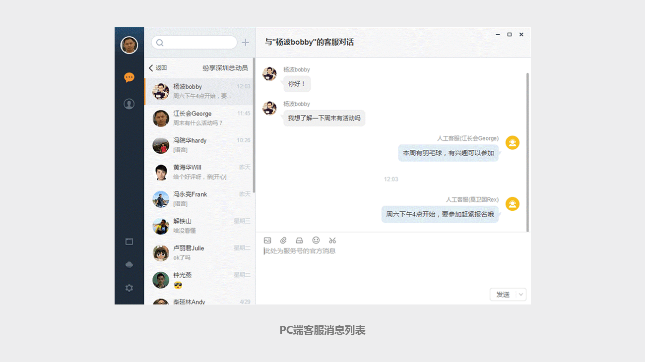 1)在PC端,收到员工的反馈后,在消息列表中会显示客服消息。