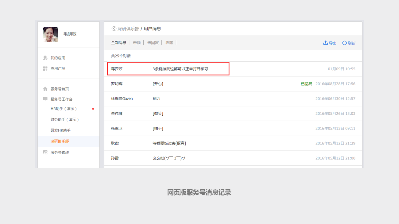 1)在【应用】频道,进入【服务号工作台】,在消息记录里就能看到该服务号所有的消息了。