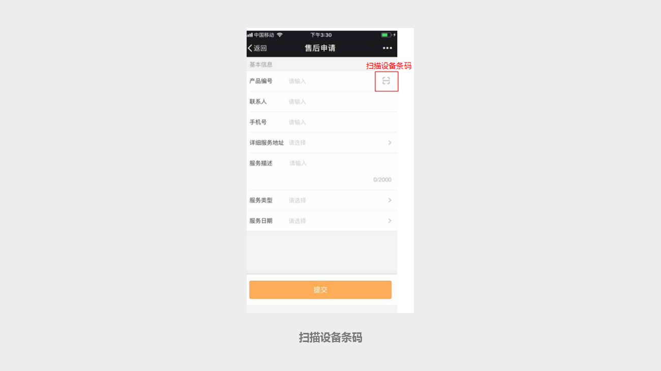 终端用户进入微信服务号的服务申请提交页面,只需要扫一扫,轻松读取产品/设备编号,免去用户手工输入的繁琐,也避免输错。